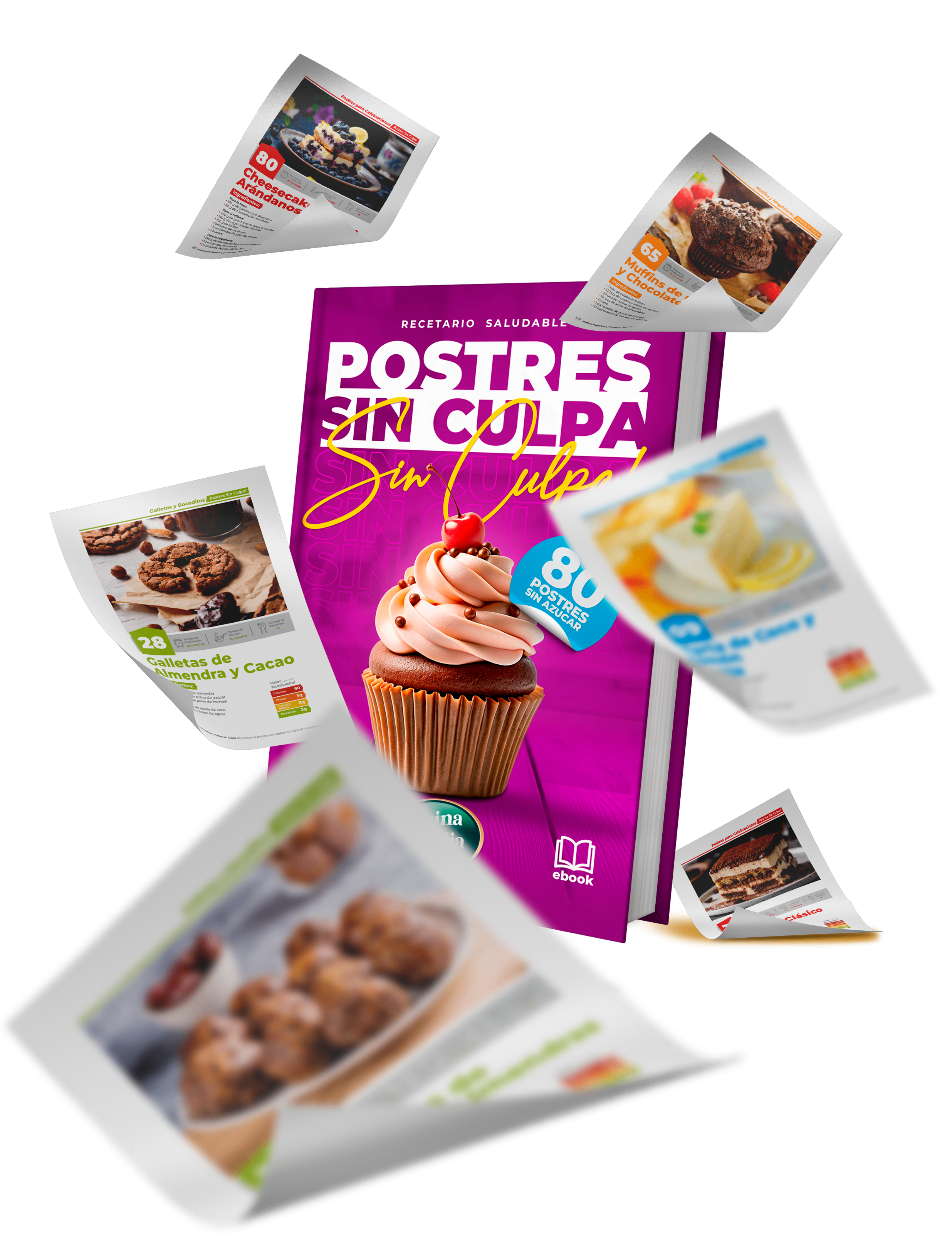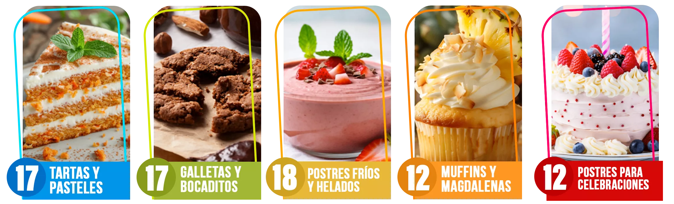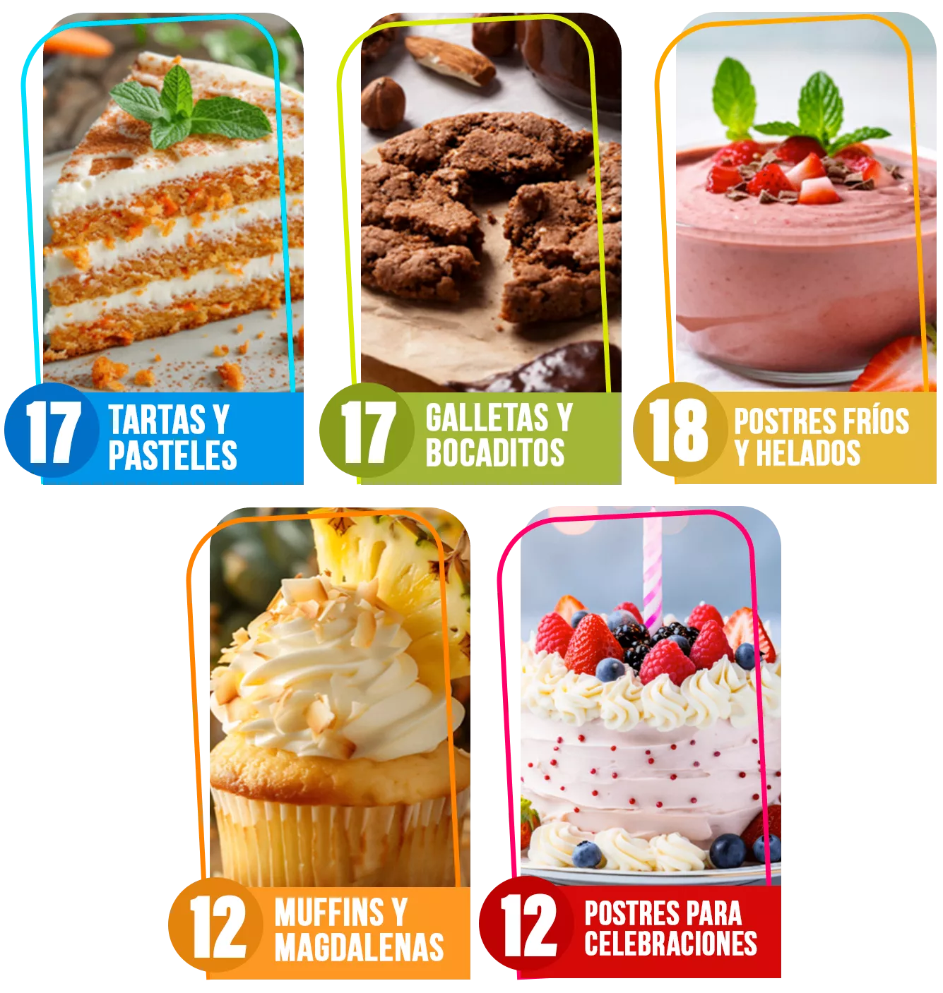El ebook incluye una amplia variedad de postres saludables: desde tartas y galletas hasta postres fríos y especiales para celebraciones. Son 80 recetas divididas en cinco categorías, para que siempre encuentres algo que se adapte a tus gustos o a cualquier ocasión.